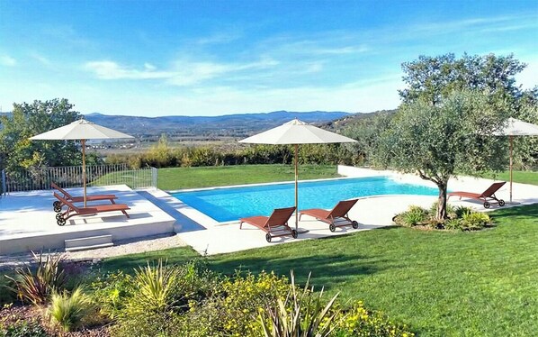 A seasonal outdoor pool along with sun loungers and pool umbrellas