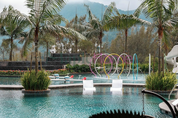 An outdoor pool and a children's pool, along with a waterslide and sun loungers