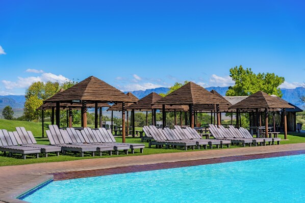 Travelers hike scenic mountain trails before enjoying hearty meals at ATKV Drakensville, where waterslides and racquetball courts create lasting family memories