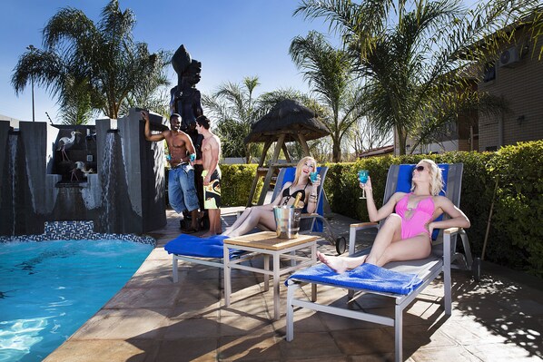 A peaceful retreat where travelers can relax by the outdoor pool surrounded by sun loungers or take a leisurely stroll through beautiful gardens