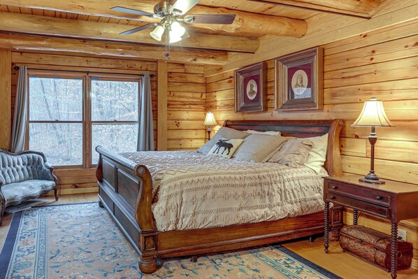 All guestrooms at Groups Welcome! Cozy Creek-front Cabin in Old Fort boast comforts such as fireplaces and air conditioning.