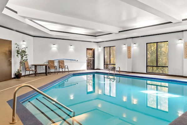 Travelers unwind by the lobby fireplace after long flights or take refreshing dips in the indoor pool at this hotel where convenience awaits at every turn