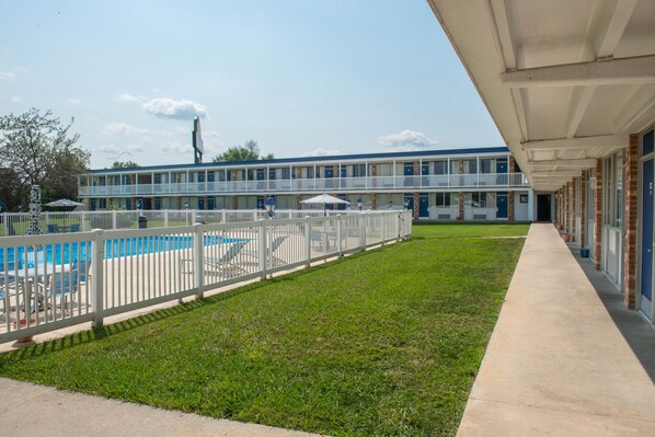 Morning coffee kickstarts adventure planning at this welcoming motel near Wayne Theatre, where travelers cool off in the outdoor pool after a day of exploration