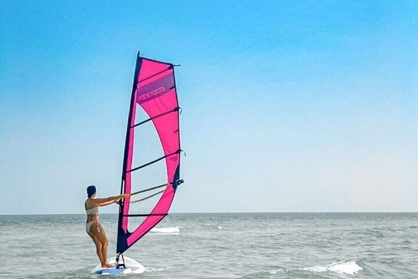 Feel the wind power your ride : in 1 hour Windsurf lesson, as you learn to control the sail and glide across the water