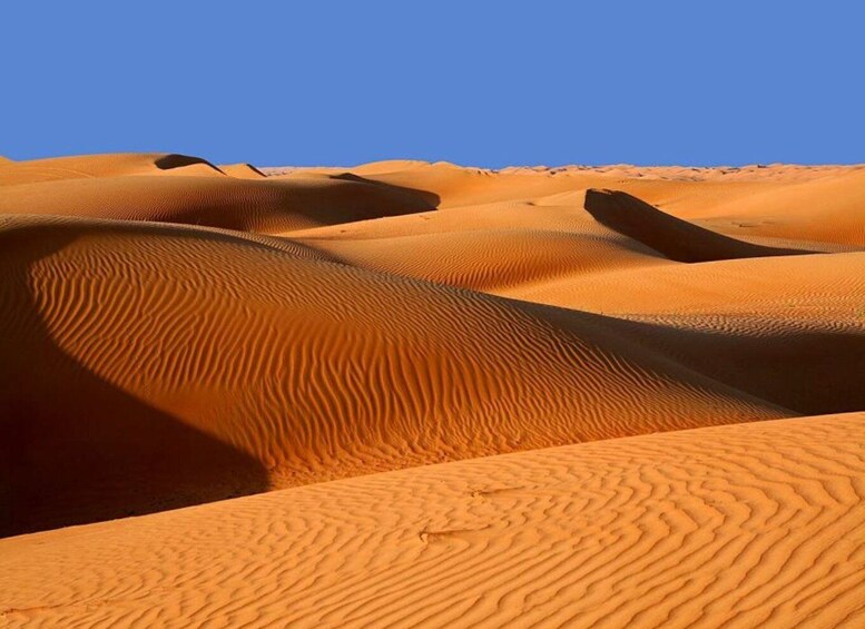 Breakfast at the Hotel. By 0830Hrs, you continue on your tour towards Nizwa, You visit the souk showcasing a wonderful array of handicrafts, swords, leather goods, silverware, antiques, next visit is the Nizwa fort, was the seat of power during the rule of the Al Ya'ruba dynasty and is Oman's most visited National monument. You will then drive to Wahiba Desert. (Lunch at your own expense) You are invited to meet with a Bedouin family and gain an intimate insight into their traditional lifestyle.