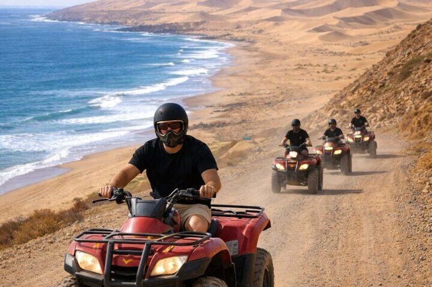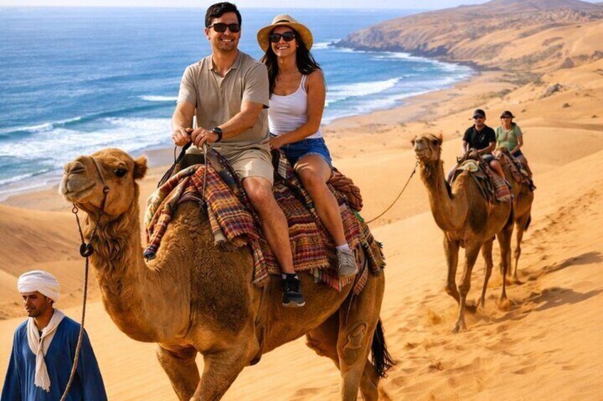 What sets our tour apart is the perfect blend of adventure and authentic Berber culture. We start with a scenic drive along the coast, passing through the surf vibes of Taghazout and the famous colorful 'Rainbow Village' of Aghroud. Once we reach the hidden Timlalin Dunes—where the golden sand literally meets the Atlantic Ocean—the real magic begins. Whether you're racing on a Quad bike or Camel or sliding down the dunes on a Sandboard, the views are unbeatable. We end the day like family, witnessing a breathtaking sunset and enjoying a traditional Moroccan dinner with mint tea under the stars. It’s not just a tour; it’s a memory you’ll keep forever.