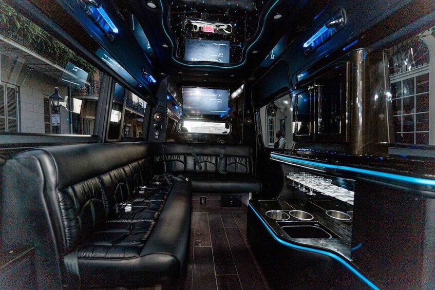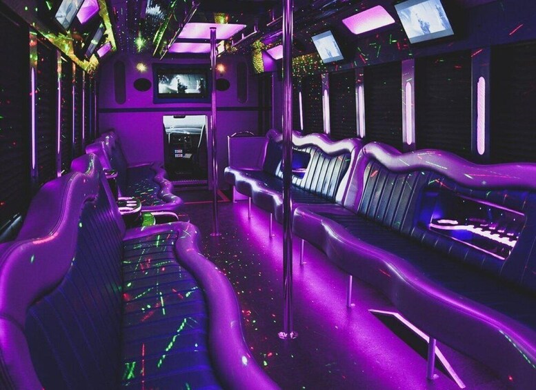 Indulge in a unique blend of luxury and excitement with our Limousine Party Bus experience. From the moment you step into the sleek, vibrant vehicle, you're greeted by an atmosphere that promises a memorable journey through Music City. The party bus is designed to elevate your celebration with plush, black leather seating, a mirrored stargazer ceiling, and a combination of opera, laser, and strobe lighting that sets the perfect mood.