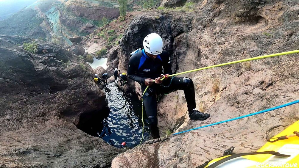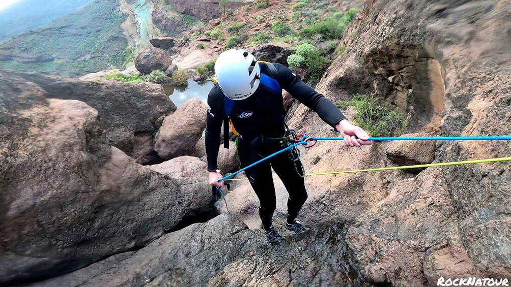 Experience the thrill of abseiling from four different heights, each with its unique technique and challenge! As we conquer the last descent, you’ll find yourself walking immersed in the canyon’s most breathtaking section, enveloped by towering walls and lush nature. Our journey continues with a scenic hike along an adventurous trail, complete with a refreshing picnic stop to recharge your energy and indulge in the delicious flavors of authentic Canarian snacks.