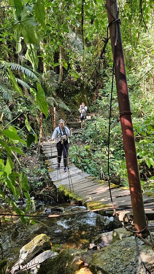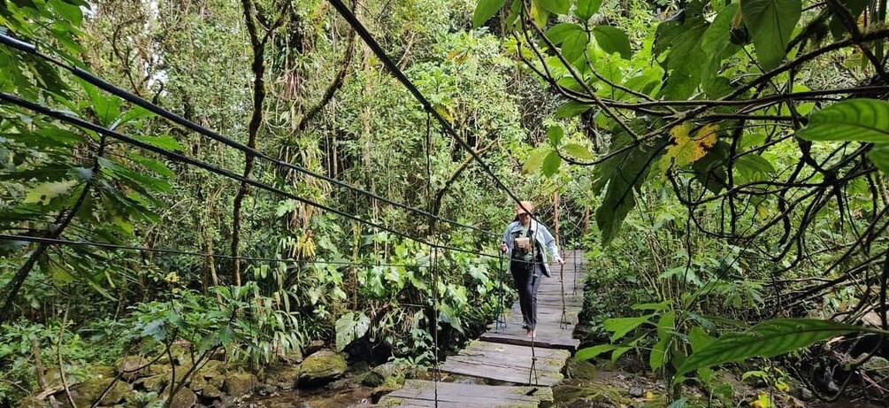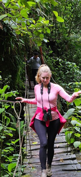 Embark on an unforgettable Cocora Valley adventure, beginning in Salento where you'll take the transport to Cocora. Your hike begins through vibrant grasslands before entering the mystical cloud forest, where a hidden waterfall awaits. Continue trekking upwards, Indiana Jones-style, crossing six exhilarating hanging bridges suspended above the Quindío River. Your destination: Acaime, the Hummingbird House, a sanctuary teeming with up to eight dazzling hummingbird species. Enjoy a traditional drink amidst these aerial wonders before your return journey. A well-deserved picnic lunch along the way provides the perfect finale to your Cocora Valley exploration before heading back to Salento.