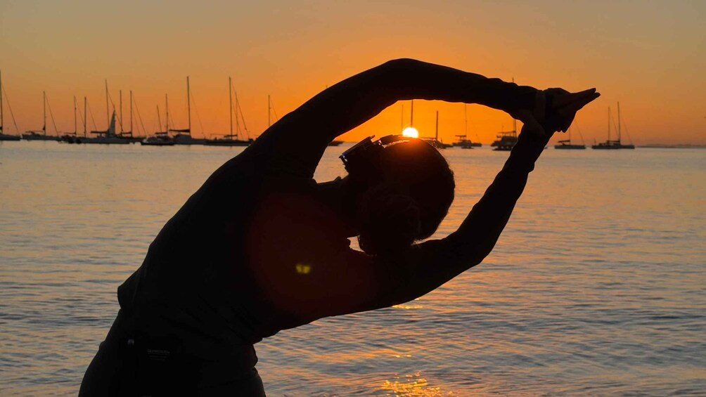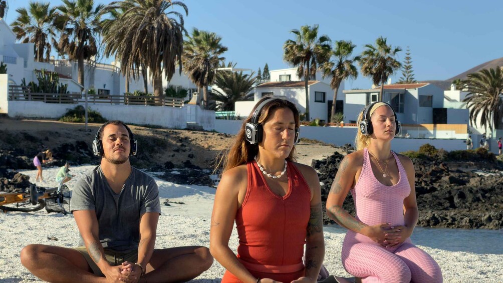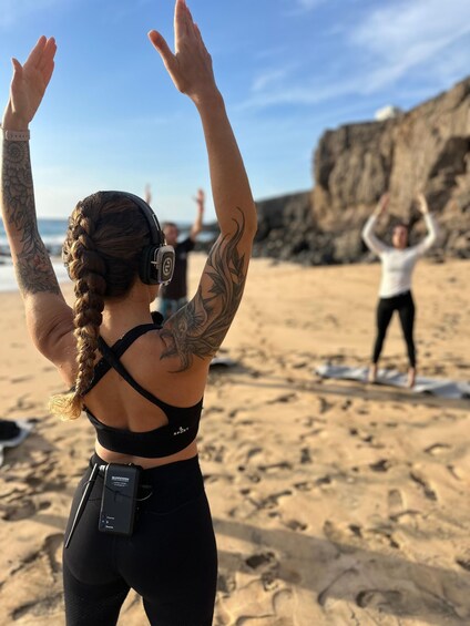 The experience is guided through a wireless headphone system, allowing you to hear the teacher clearly and stay fully immersed in the practice while enjoying the sounds and atmosphere of the ocean.