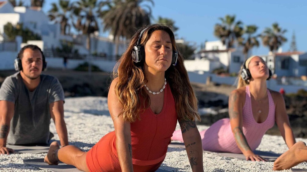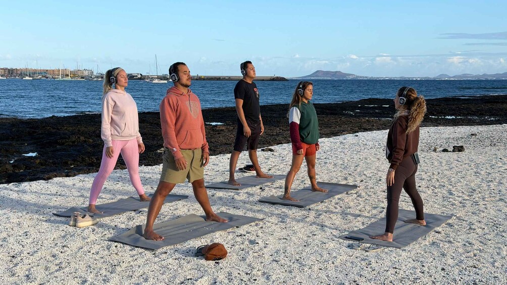 Start your morning with a guided outdoor Silent Yoga experience on the beautiful Playa Vista Lobos in Corralejo, overlooking the Atlantic Ocean and the island of Lobos.