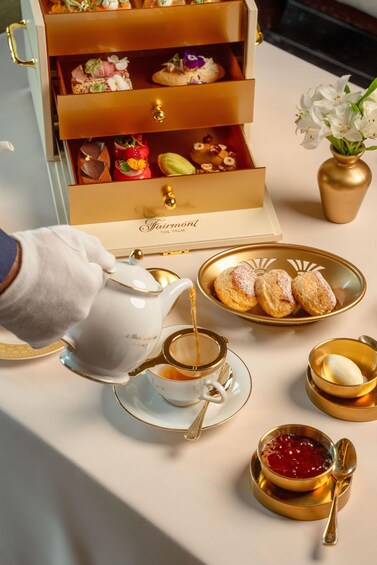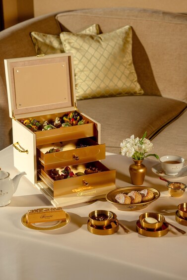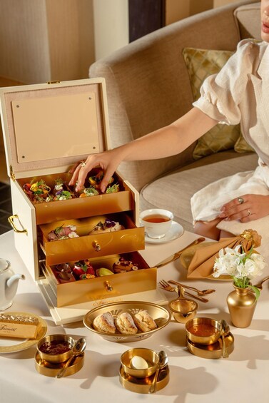 Inspired by the region’s rich heritage and the hotel’s arabesque interiors, the experience unfolds in a jewelry box-style presentation, offering a curated selection of savory and sweet delights infused with golden accents. Guests can indulge in delicacies like Foie Gras on golden brioche, Caviar-topped Smoked Salmon and Pistachio-Yuzu Madeleines.
