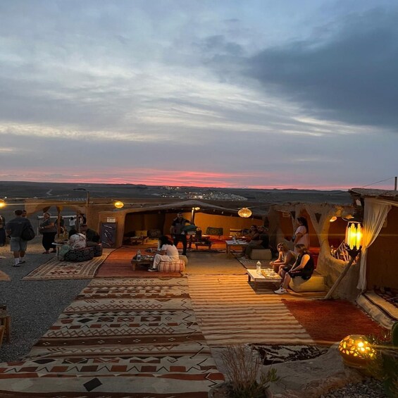 After your Marrakech camel trekking experience, arrive at a traditional Berber-style desert camp. You’ll be welcomed with authentic Moroccan mint tea before settling into a beautifully decorated setting illuminated by lanterns and candlelight. As night falls, the atmosphere transforms into a magical desert escape under the stars.