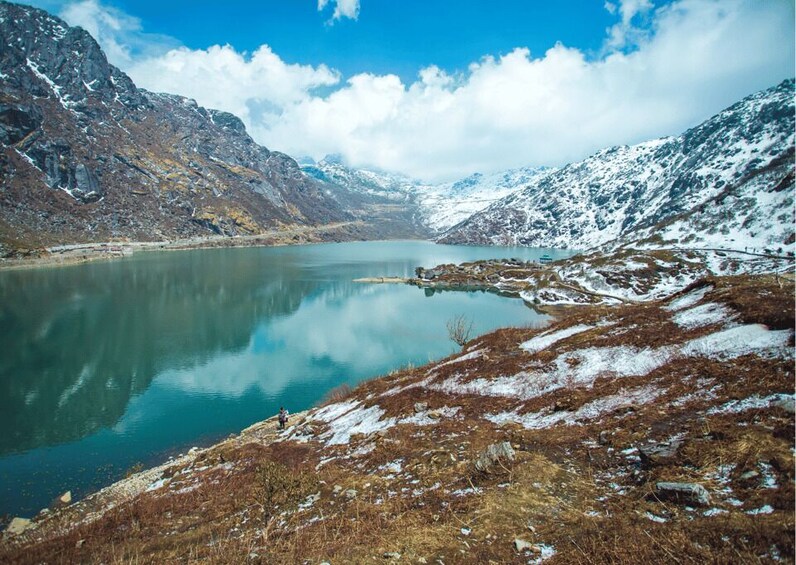 Explore Tsomgo Lake, a scenic natural area featuring a lake surrounded by snowy mountains and remains frozen during the winter season.