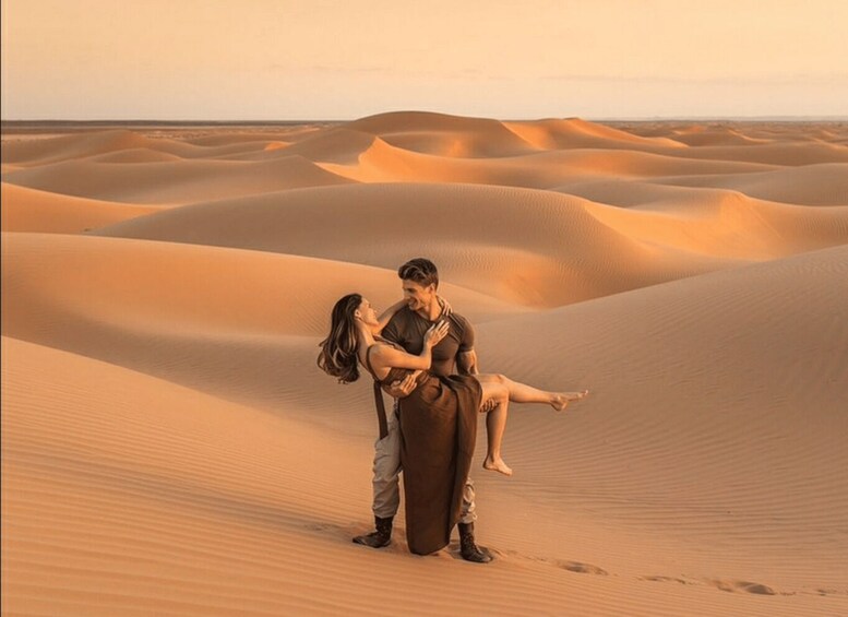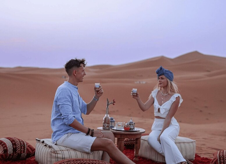 Enjoy a private tour with an overnight stay an at upscale riad and 1 night in the Royal Desert Camp with Quad Bike & Sandboarding & Camel Ride.