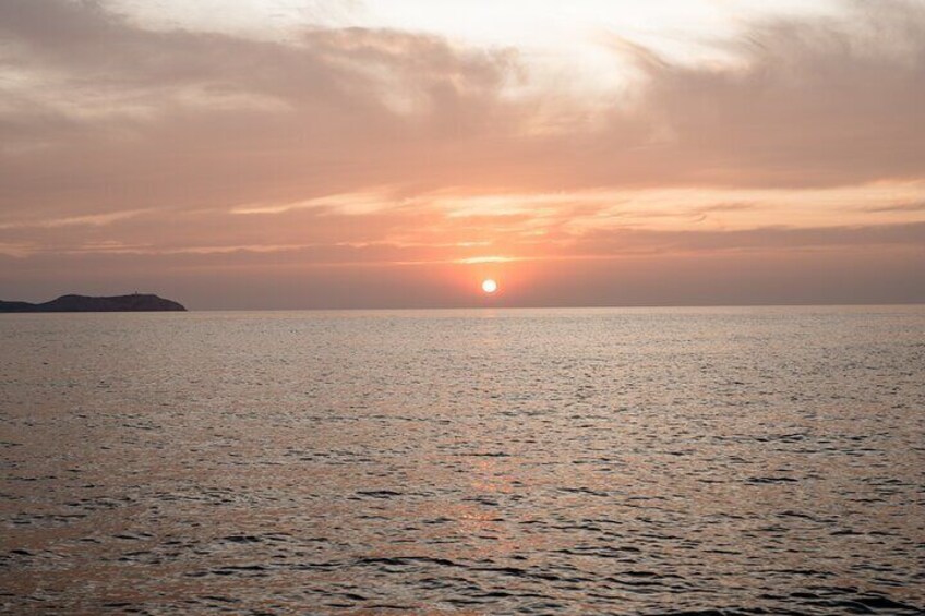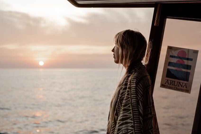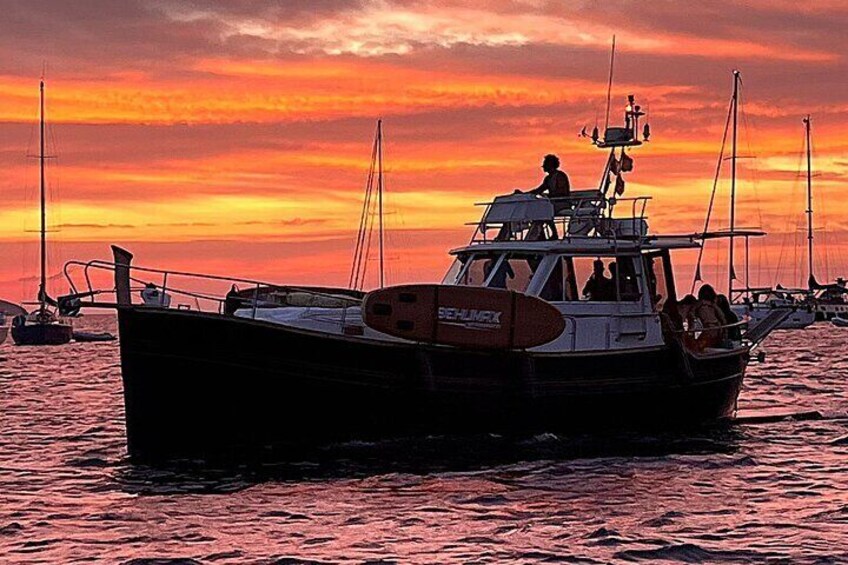 One of our beautiful outings is the sunset cruise. From Aruna, you can enjoy stunning views of the sunset at iconic spots like Ses Margalides, Cala Conta, Cala Bassa, Café del Mar, or Café del Mambo—or simply relax floating in the sea as the sun goes down, creating a truly magical experience