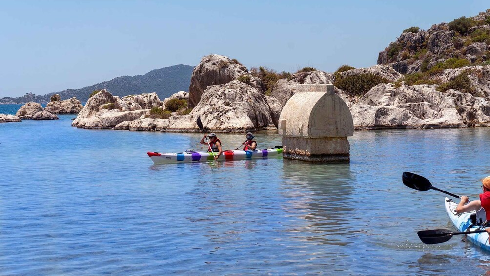 From there the group will slowly paddle over the ancient Lycian Sunken City of Kekova. Since this is a protected area, swimming is not permitted here. So what better way to explore the Sunken City than by Kayaking alongside the ruins; giving you the chance to capture unforgettable photos.