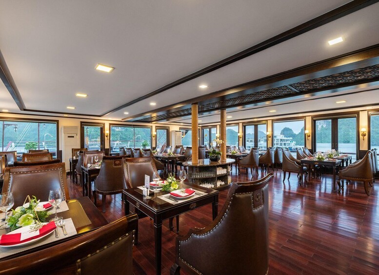Begin your experience with an authentic Tender Boat transfer from the wharf to your vessel. Get settled in on board with a welcome drink as you receive a safety briefing from the crew. Set sail and have lunch in the restaurant. Take in the beauty of the canals on the way to Ha Long Bay.