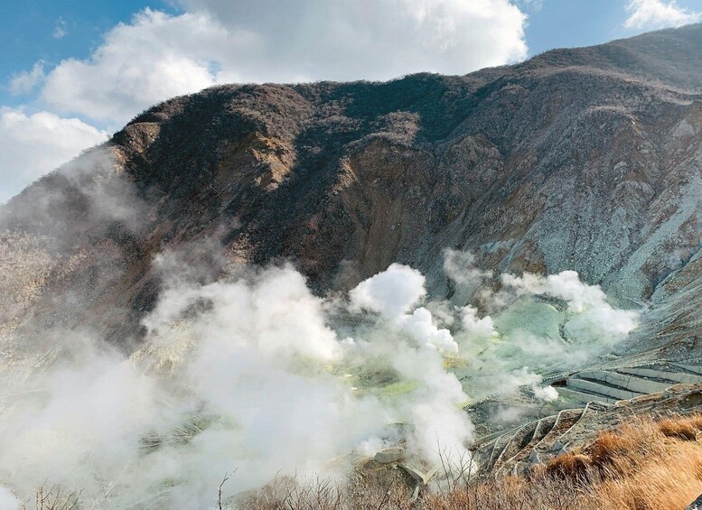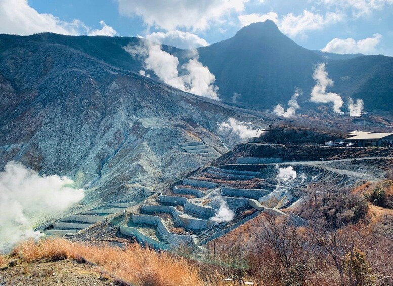 • Conclude your day at the stunning Mount Owakudano, where natural beauty and culinary delights await. Ascend to the summit for breathtaking panoramic views of Mt. Fuji and the surrounding landscape. Then, treat yourself to the famous black onsen eggs, boiled in the geothermal waters of Owakudani. Legend has it that each egg adds seven years to your life – talk about a tasty bonus!