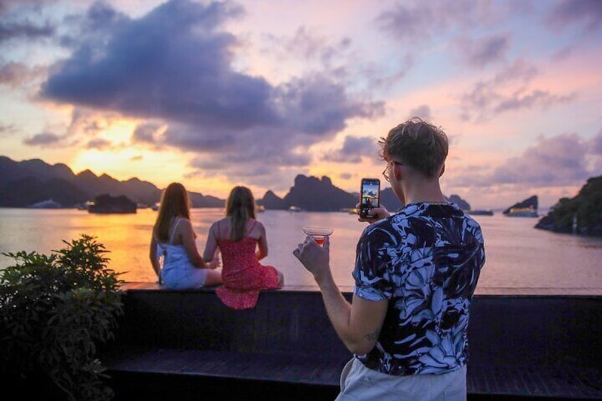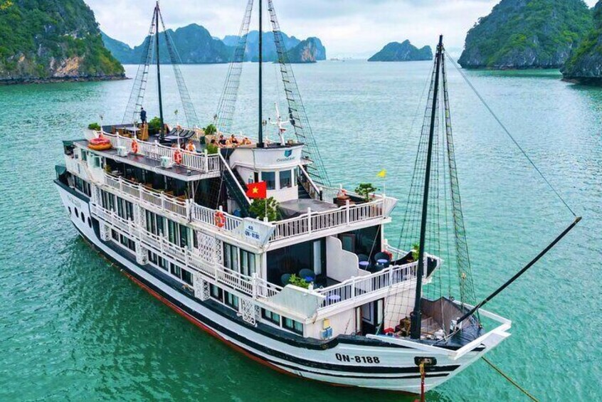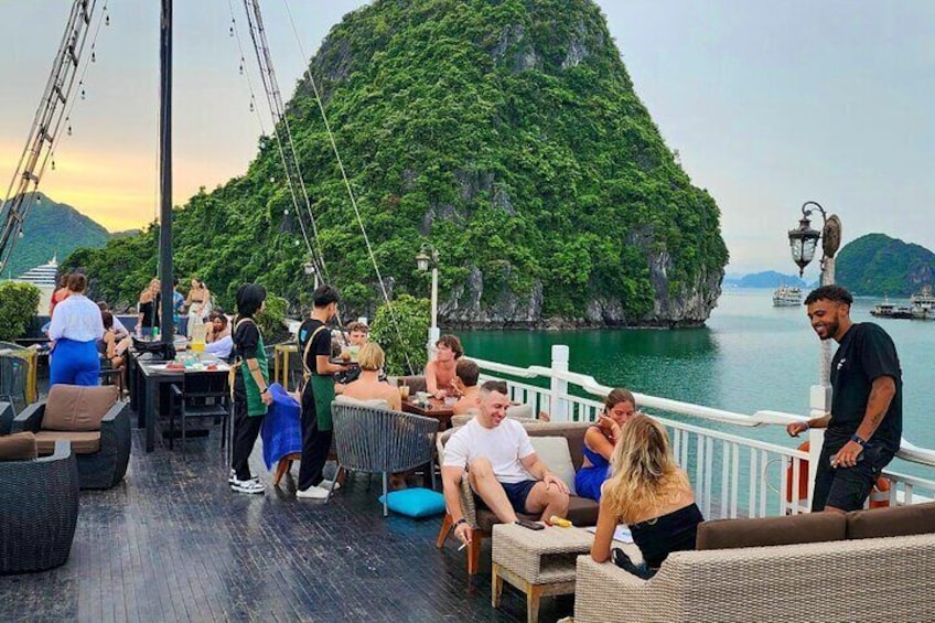 17:00: Time to return to the main cruise, it’s the best time for relaxing, sunbathing on the sundeck. Oasis cruise moves to the overnight area. 18:00 - 19:00: As the sun sets, a light sunset party will be served with fresh fruit juice, along with the Happy Hour promotion at the bar (buy 2 drinks, get 1 free). 19:00 - 20:30: You will savor a fine dinner prepared by a team of talented chefs. Each dish is a delicate blend of traditional Vietnamese and Western cuisine. 20:30 onwards: Join the evening activities Our guide and staff will organize fun games to bring guests together, with options to listen to music, join a lively karaoke party or simply enjoy a drink at the bar. NOTE: The bar closes at 4:00 AM.