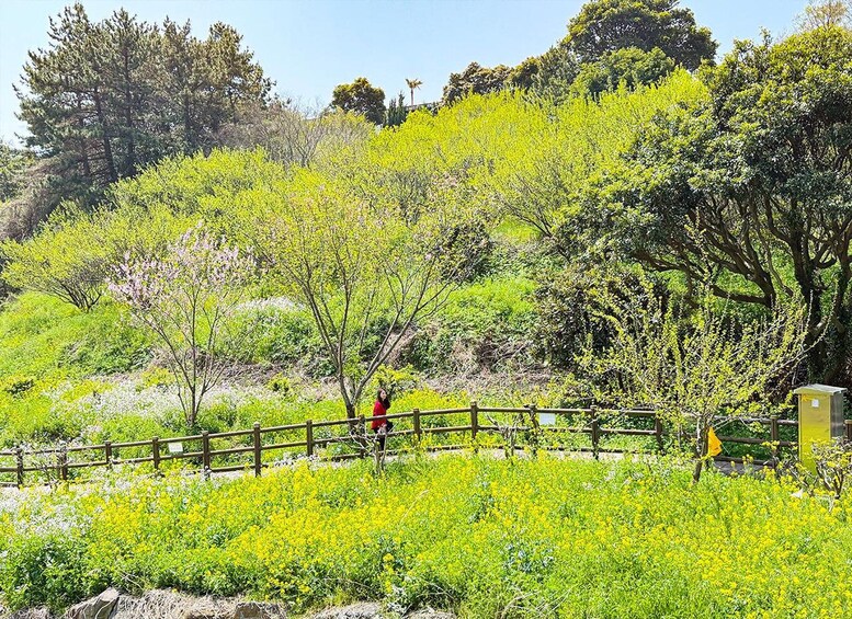 • Camellia Hill Jeju’s garden with spring camellia and canola blooms