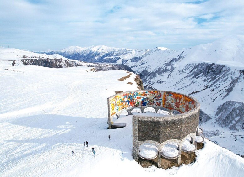 • After 50 minutes of driving, arrive at the Gudauri Friendship Monument, also known as the Georgian-Russian Friendship Monument. This circular viewpoint hangs over a 600-meter cliff, offering panoramic views of the Caucasus Mountains. You will stay here for about 35 minutes.