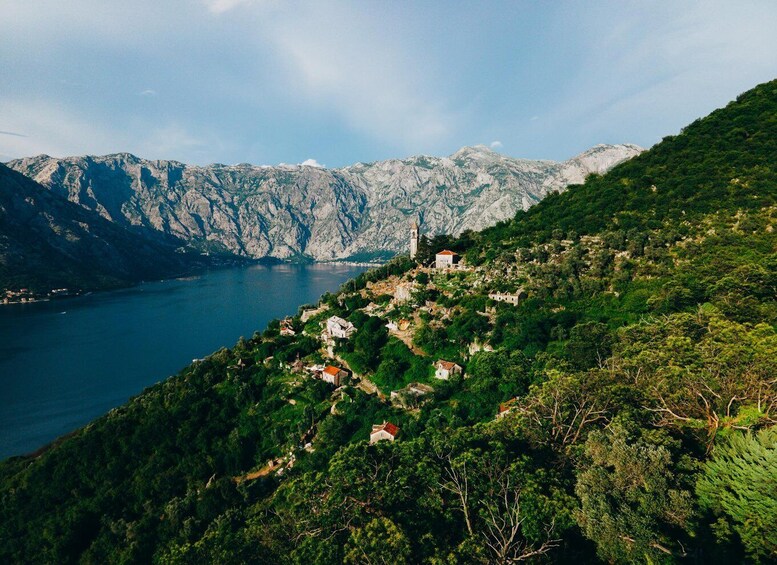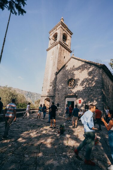 On arrival at Gornji Stoliv, we explore the hidden medieval stone village on foot. Your guide explains how families once lived here, moving seasonally between mountain and coast. We follow narrow 14th-century paths between abandoned houses, olive groves and terraced gardens, with panoramic views of the Bay of Kotor below. The highlight is the Church of St. Elijah, a historic 13th-century stone church with a tall bell tower and stunning mountain-to-sea scenery. This church is normally closed to the public, and our guide provides exclusive access for a private visit inside.