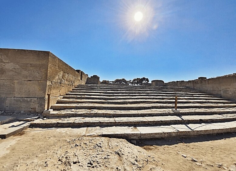 Departing from Heraklion, the route leads first to Phaistos Palace, one of the most important Minoan sites in Crete, overlooking the Messara Plain. Historical background and context are provided outside the site, with time to explore independently.