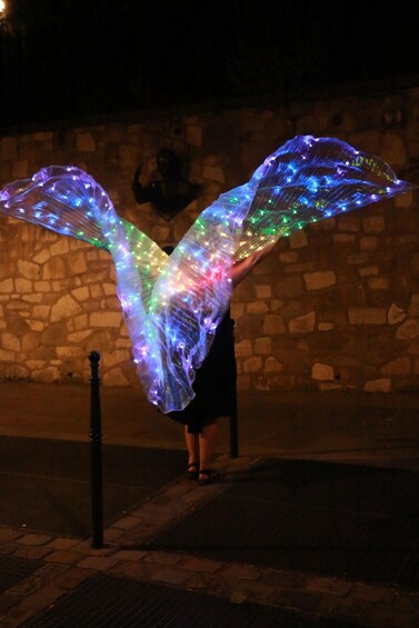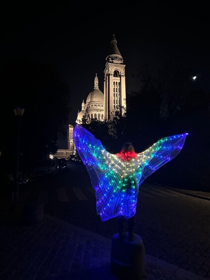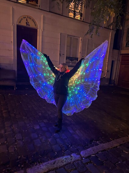 What's included What's included - Un tour moins chanté à pleine voix que guidé, en français et en anglais, costumé d'ailes lumineuses. L'artiste conceptrice vous invite à porter sur vous un objet lumineux et ou un vêtement pour participer à la magie de la nuit.