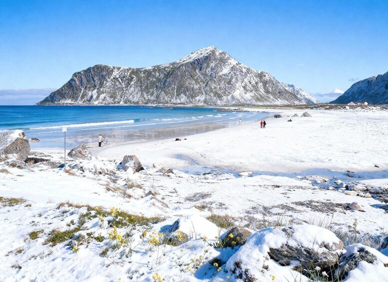 Continue to Skagsanden Beach, a white sandy stretch surrounded by towering peaks. The beach features a blend of white quartz sand and black olivine sand, creating intriguing patterns. It's an ideal spot for landscape photography, where you can marvel at the changing colors of the waves, sand, and sky. Nearby, the Flakstad Church (built in 1780) with its white exterior and red roof is worth a visit.
