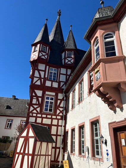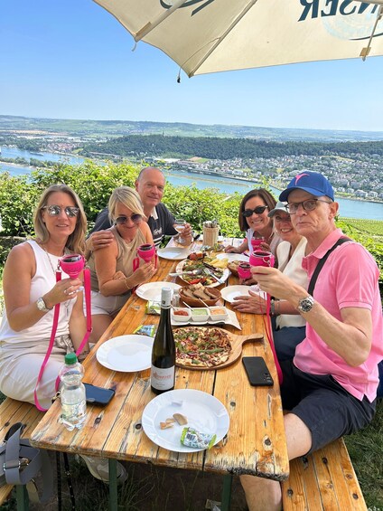 We will start at 12:00 PM at the historic Musikkabinett. Here, you will be welcomed with a glass of our “Plauderbraue” house sparkling wine. The group will get to know each other a bit; even those who are traveling alone won't feel lonely here. Within the ancient walls of a former knight's castle, we will listen to the sounds of magical instruments. Next, we'll head for the cable car, which will take us up over the vineyards to Niederwald. We will start our wine tasting right next to the Germania figure. Passing the Romantik Tempel, we will hike to the Rebenhaus, a quaint tavern in the middle of the vineyard, where a hearty snack will be waiting for you. Here, you can enjoy your meal, and three more wines will be served.