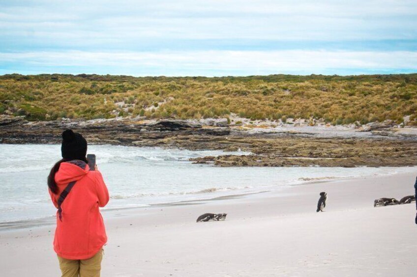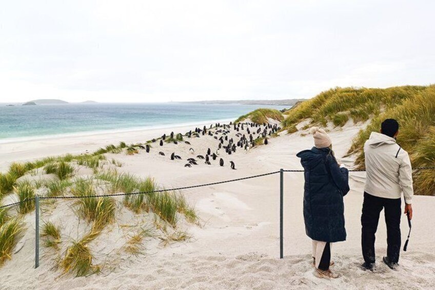 Picture yourself strolling along pristine white‑sand beaches, wandering through rolling sand dunes, and meeting the iconic penguins that call the Falklands home—all just steps away.