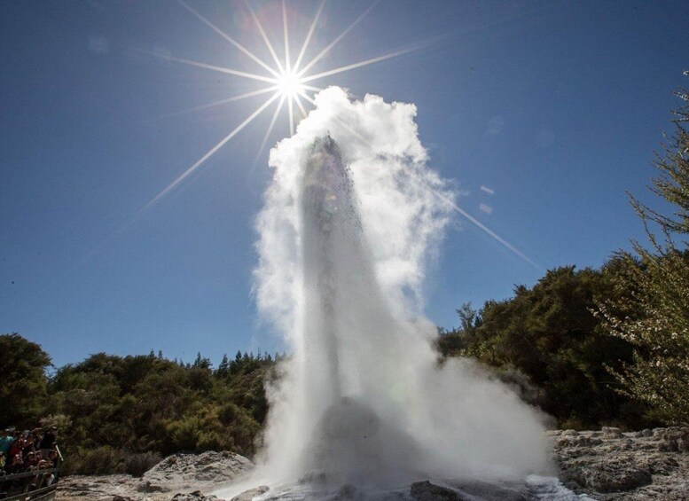 Enjoy local treats and hear stories of “Kiwi” culture and history as our experienced guide shows you through what we believe is the very best of New Zealand' s geothermal parks- The amazing Wai-o-Tapu Thermal Wonderland. Take time to explore this dramatic and beautiful park, and witness the famous Lady Knox Geyser, shooting more than 10M in the air. We take you to see the most spectacular of the bubbling mud pools in a hidden area on our way back to Rotorua.