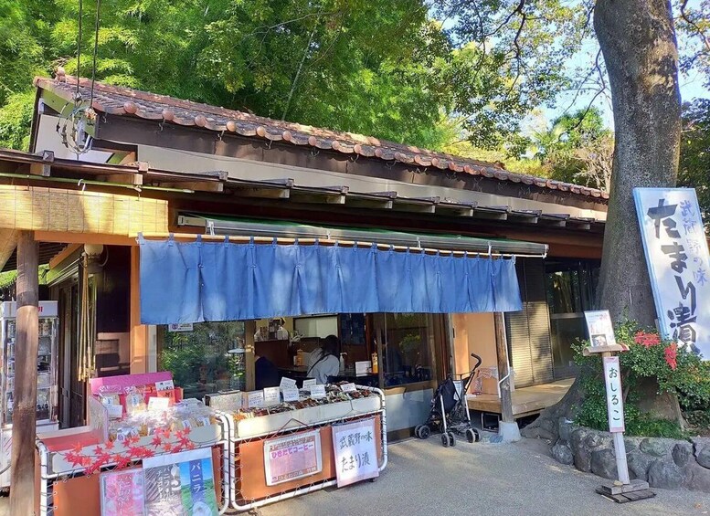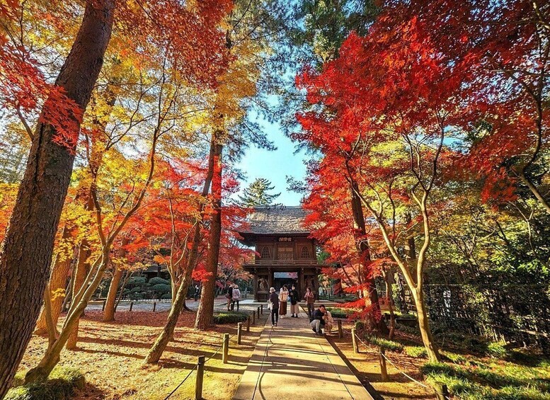 After exploring the historic temple and its maple-lined paths, unwind at the charming forest café Hirune no Mori Chuei — a hidden retreat surrounded by tall trees where you can enjoy tea, handmade Japanese sweets, or light soba and udon dishes.