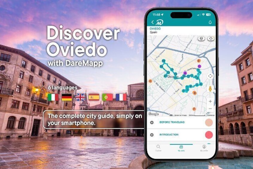 Visit Oviedo at your own pace without groups or schedule with your mobile in Multilingual