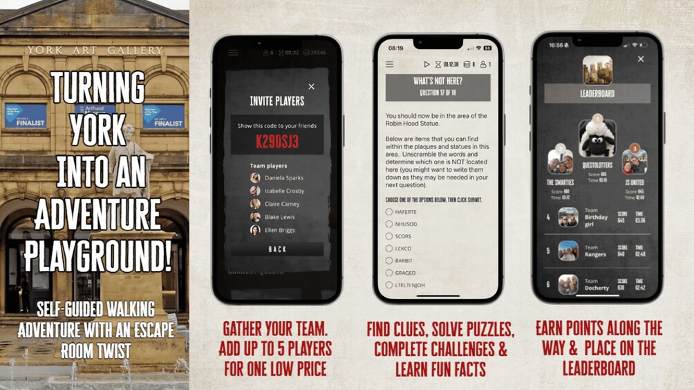 Explore the streets of historic York as your team unlocks a hidden trail, finding clues, solving puzzles, and completing challenges, earning points along the way all self-guided through the Go Quest Adventures app. See the area's highlights, explore its hidden gems, and learn some insider history and fun facts along the way.