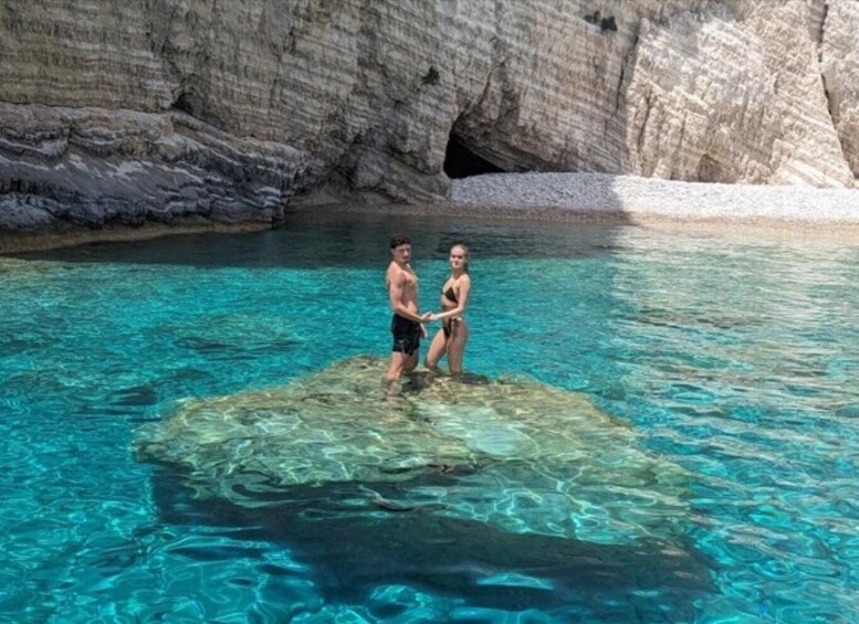 For lunch, you can stop at the best restaurant on the island with the best view of the Myzithres and admire the emerald waters and scenic views as you enjoy your lunch. You will visit the amazing viewpoint of Myzithres with its two tall and imposing white rocks that project from the crystal clear waters of the southwestern coast and the incredibly brilliant, blue, and glistening waters that you were swimming before. Capture the most awesome photos of you with all that marvelous view in the background.
