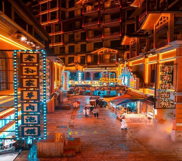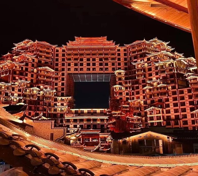 Afternoon/Evening: Upon arrival at Zhangjiajie (DYG), meet your guide and driver for a transfer to your hotel. Your evening features a complimentary visit to the 72 Odd Towers. This Guinness World Record complex dazzles at night with vibrant light shows projected onto traditional stilted buildings. Explore the lively food market and enjoy cultural performances for a perfect introduction to the local Tujia culture.